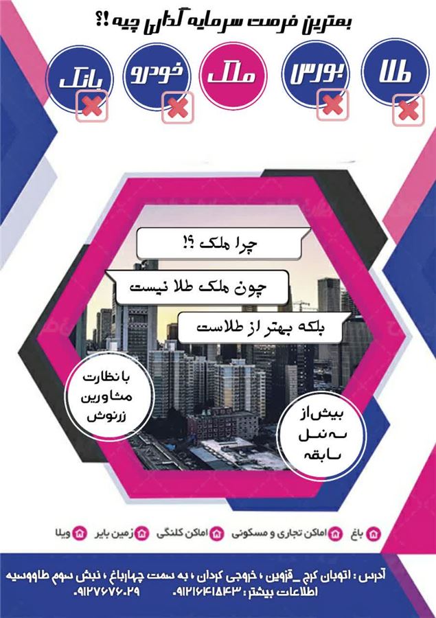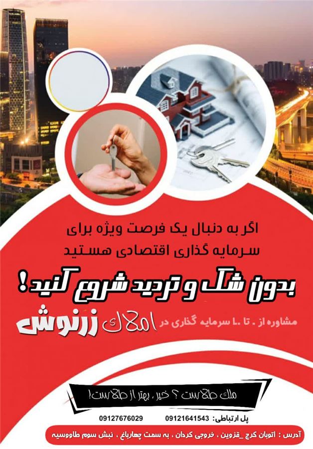 در جهت ارتقا معاملات و جلوگیری از حباب قیمت ها امادگی خود را در راستای خرید - فروش - تهاتر (باغ - باغچه - زمین - سالن - سوله و...) اعلام میدارد