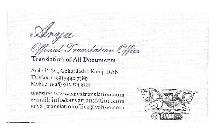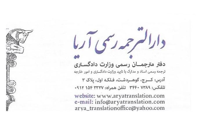 کرج ، فلکه اول گوهردشت ، ابتدای خیابان اصلی ، روبروی ایستگاه تاکسی ، پلاک 3 ، دارالترجمه آریا