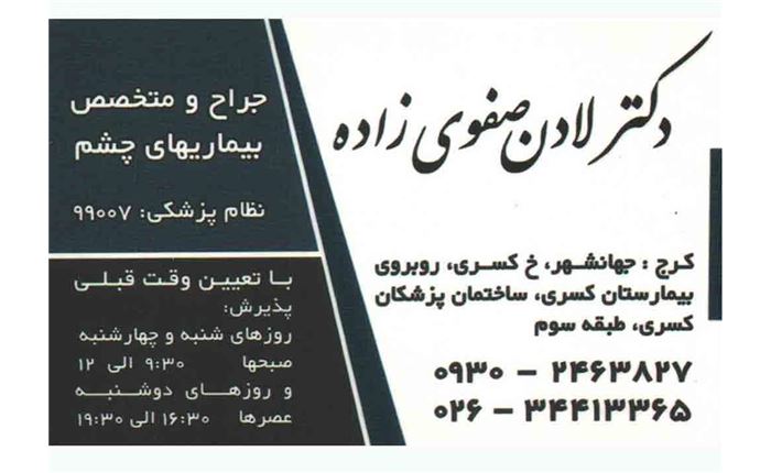 کرج ، جهانشهر ، خیابان کسری ، روبروی بیمارستان کسری ، ساختمان پزشکان کسری ، طبقه 2 ، واحد 5