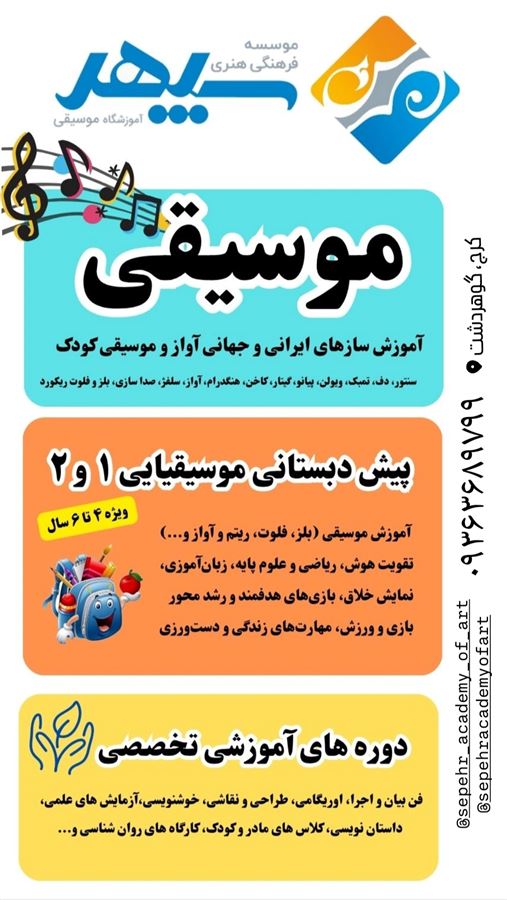 - آموزش تخصصی سازهای ایرانی و جهانی ، آواز و موسیقی کودک